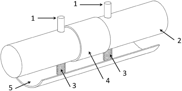 3.根据权利要求2所述的一种竖向碰撞型的调谐质量阻尼器,其特征在于,所述主结构为圆管(6)时,质量块(2)为圆柱体,固定底片(5)为一与圆管(6)内壁相吻合的弧形板;所述两根刚性限位杆(1)从质量块(2)上的两个贯通孔伸出后与主结构的圆管(6)内壁接触或相固定;所述质量块(2)上的两个贯通孔对称地设置在质量块圆柱体中截面的两边。