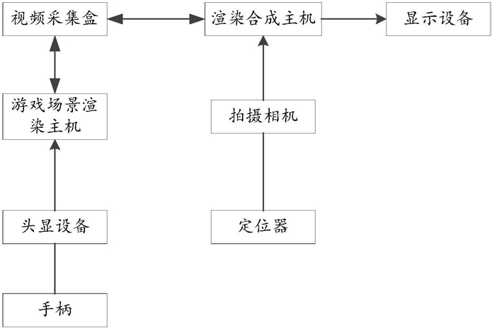 S5:渲染合成主机将游戏场景渲染主机传输的平面图像和拍摄相机拍摄的体验者图像合成三维虚拟现实混合场景,并将三维虚拟现实混合场景的图像传输给显示设备;