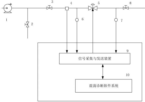 1)根据实验要求,通过控制阀测试管路系统对待测的控制阀(5)提供若干个有负载运行的模拟工况的测试环境;2)通过预置在控制阀测试管路系统上的信号测量装置测量每个模拟工况下的控制阀管路系统的管路信号;3)由信号采集与发送装置(9)对步骤2)采集的管路信号进行采集、保存并传送至震荡诊断软件系统(10);4)由震荡诊断软件系统(10)对接收到的管路信号进行处理,得到控制阀(5)在每个模拟工况下的反馈阀位Ki的阀位波动值Kδ;5)将步骤4)得到的反馈阀位Ki的阀位波动值Kδ与震荡诊断软件系统(10)中储存的阈值Ω进行比较,判断控制阀阀位是否异常震荡;