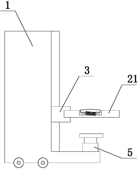 车体(1)底部设有车轮,车体(1)一侧设有水平伸出的支撑座,车体(1)上设有竖直延伸的升降滑轨,升降滑轨上设有可滑动安装的滑座(3),滑座(3)上设有竖直设置的转轴;