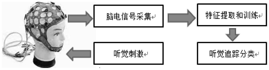 特征提取模块和训练模块,对经脑电信号采集模块预处理后的脑电听觉信号进行特征提取,并根据已经确定好分类的脑电信号对应的特征来训练出能识别分类的分类模型,分类模型再识别未确定好分类的脑电信号的特征,进行自动分类;