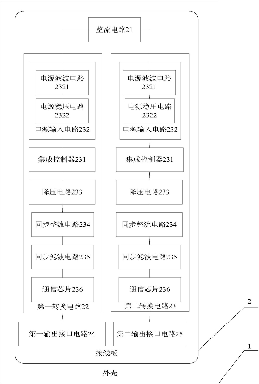 1.一种电源转换插座,包括外壳和设置在所述外壳内部的接线板,其特征在于,所述接线板上设置有与交流电源连接的整流电路,所述整流电路的输出端至少连接第一转换电路和第二转换电路,所述第一转换电路连接第一输出接口电路,所述第二转换电路连接第二输出接口电路,其中所述第一转换电路和/或第二转换电路分别包括集成控制器、电源输入电路、降压电路;