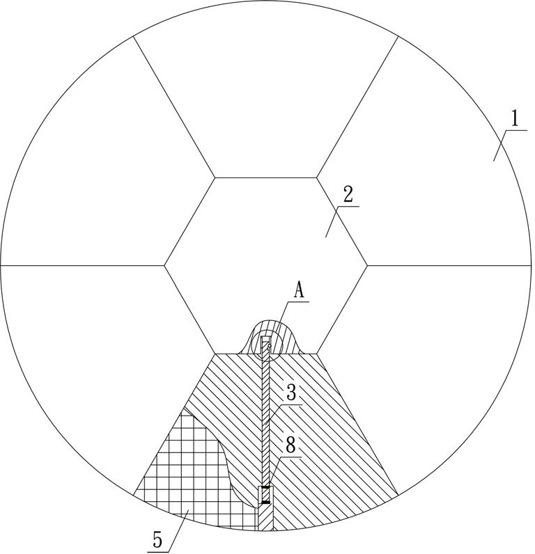 1.一种快速安装过滤布,包括扇形块(1)和转股(2),其特征在于,所述扇形块(1)和转股(2)之间通过压紧释放装置拼接成滤盘,所述转股(2)处于滤盘的中央位置,扇形块(1)为六个且沿转股(2)外侧均匀分布,扇形块(1)的上表面粘贴滤布(5),所述压紧释放装置嵌入式依次布设在转股(2)的凹槽(6)内,压紧释放装置包括布设在扇形块(1)上的凸柱(4)和滑动轴(3),所述滑动轴(3)穿过扇形块(1)内的台阶孔,滑动轴(3)由两直径不同的圆柱段构成,滑动轴(3)的末端设有台阶槽(7),所述台阶槽(7)包括平底槽和斜底槽,所述平底槽和斜底槽由斜坡过渡相连;台阶槽(7)内布设有滚珠(9),所述滚珠(9)通过凸柱(4)上面的通孔与转股(2)的锥形孔接触连接,所述锥形孔布设在凹槽(6)内侧壁上。