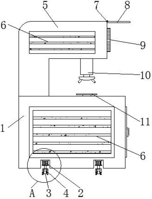1.一种便于移动的可调节电缆测量投影仪,包括机座(1)机架(5)和散热孔(6),其特征在于:所述机座(1)下端内部安装有液压缸(2),且液压缸(2)下端安装万向轮(3),所述万向轮(3)外侧安装有调节机构(4),所述机架(5)设置于机座(1)上端,且挡板(8)内侧通过轴销(7)与机架(5)相连接,所述机架(5)右侧固定有显示器(9),且机架(5)右侧下端安装有显微镜(10),所述显微镜(10)下端设置有载物台(11),且载物台(11)位于机座(1)右侧上端。