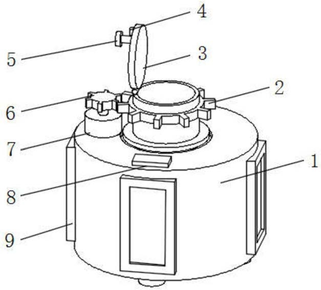 1.一种近红外光谱分析仪的旋转样品装置,包括壳体(1),其特征在于:所述壳体(1)的上表面设有通孔,所述通孔内转动连接有放置筒(13),所述通孔的侧面设有滑槽(14),所述放置筒(13)侧面相对应滑槽(14)的位置处设有滑块(10),所述滑块(10)与滑槽(14)滑动连接,所述放置筒(13)侧面靠近上表面的位置处设有从动轮(2),所述从动轮(2)啮合连接有主动轮(6),所述主动轮(6)的下表面连接有伺服电机(7),所述放置筒(13)上表面的一端设有合页,所述放置筒(13)通过合页连接有上盖(3),所述上盖(3)的外表面设有把手(5),所述壳体(1)的上表面设有控制开关组(8),所述控制开关组(8)的输入端电连接外部电源的输出端,所述控制开关组(8)的输出端电连接伺服电机(7)的输入端。
