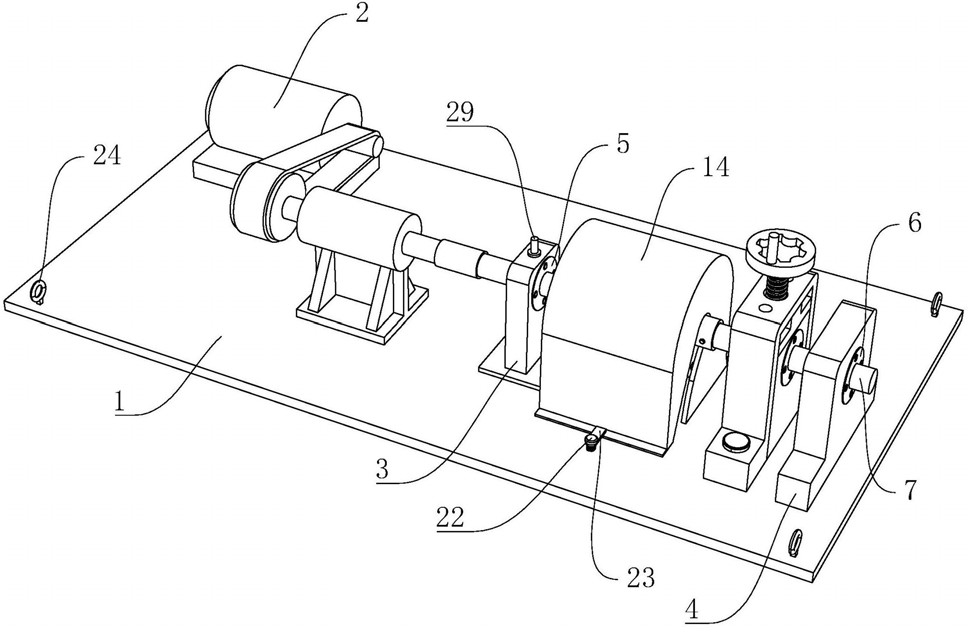 8.根据权利要求3所述的滚动轴承故障诊断测试装置,其特征在于:所述保护罩(14)的一侧与底板(1)铰接,所述底板(1)上螺纹连接有第二螺栓(22),所述第二螺栓(22)上转动连接有可压持保护罩(14)固定于底板(1)的压块(23)。