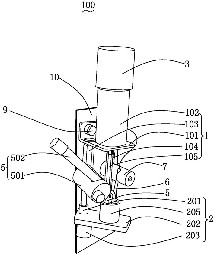 7.根据权利要求1-6任意一项所述的三电极旋转电极装置,其特征在于:所述信号丝组件包括空心信号螺丝、绝缘片以及第一焊片,所述绝缘片安装于所述空心信号螺丝,所述第一焊片夹设于所述空心信号螺丝和所述绝缘片之间,所述直流电机的电源线穿过所述空心信号螺丝延伸至所述机箱外。