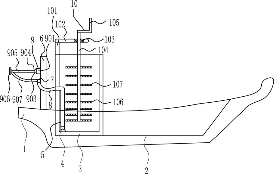 1.一种清理水葫芦用自动喷洒杂竹净设备,其特征在于,包括有船体(1)、水箱(3)、水泵(4)、出水管(5)、第一支撑板(6)、空心管(7)、第一软管(8)、喷洒机构(9)和搅拌机构(10),船体(1)顶部开有第一凹槽(2),第一凹槽(2)内底部左侧设有水箱(3),水箱(3)内底部左侧设有水泵(4),水泵(4)上端设有出水管(5),出水管(5)上端穿过水箱(3)左壁上部,船体(1)顶部左侧设有第一支撑板(6),第一支撑板(6)左侧中部设有空心管(7),空心管(7)底部中间设有第一软管(8),第一软管(8)右端与出水管(5)左端连接,第一支撑板(6)左侧上部设有喷洒机构(9),喷洒机构(9)位于空心管(7)上方,水箱(3)左壁顶部设有搅拌机构(10);喷洒机构(9)包括有连接架(901)、电动推杆(902)、滑轨(903)、滑块(904)、摆动杆(905)、喷头(906)、第二软管(907)、移动杆(908)和连接杆(909),第一支撑板(6)左侧上部设有连接架(901),连接架(901)左侧前后对称设有滑轨(903),滑轨(903)上滑动式设有滑块(904),前后两方的滑块(904)左端对称设有摆动杆(905),前后两方的摆动杆(905)左端对称设有喷头(906),喷头(906)右侧下部设有第二软管(907),第二软管(907)右端与空心管(7)左侧连接,电动推杆(902)左侧设有移动杆(908),移动杆(908)前后两端转动式设有连接杆(909),前方的连接杆(909)前端与前方的滑块(904)上端转动式连接,后方的连接杆(909)后端与后方的滑块(904)上端转动式连接;搅拌机构(10)包括有支撑架(101)、固定架(102)、轴承座(103)、转轴(104)、转杆(105)和叶片(106),水箱(3)左壁顶部设有支撑架(101),支撑架(101)顶部设有固定架(102),固定架(102)右部镶嵌式设有轴承座(103),轴承座(103)上安装有转轴(104),转轴(104)上端设有转杆(105),转轴(104)下部均匀设有叶片(106),叶片(106)前侧均匀开有第一通孔(107);还包括有气缸(13)、第二支撑板(14)、船锚(15)、电动绕线轮(17)和拉绳(18),船体(1)底部右侧开有第二凹槽(11),第二凹槽(11)内左壁下部开有第三凹槽(12),第三凹槽(12)内左壁中间设有气缸(13),气缸(13)右侧设有第二支撑板(14),第二凹槽(11)内放置有船锚(15),船锚(15)底部与第二支撑板(14)顶部接触,船体(1)顶部右侧开有第二通孔(16),船体(1)顶部右侧设有电动绕线轮(17),电动绕线轮(17)上绕有拉绳(18),拉绳(18)下端穿过第二通孔(16),拉绳(18)下端与船锚(15)顶部连接;还包括有电机(19),固定架(102)顶部右侧设有电机(19),电机(19)的输出轴与转轴(104)上端连接;还包括有固定块(20)、盖板(21)和拉手(23),水箱(3)左壁内侧上部设有固定块(20),水箱(3)顶部设有盖板(21),盖板(21)底部左侧与固定块(20)上端接触,盖板(21)左侧中间开有第三通孔(22),转轴(104)位于第三通孔(22)内,盖板(21)右侧中间设有拉手(23)。