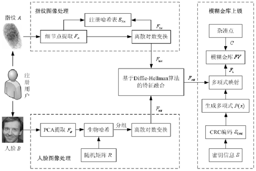 1.一种基于指纹与人脸特征级融合的模糊金库实现方法,其特征在于如下步骤:步骤1.1利用Diffie-Hellman算法,将经过离散对数变换的指纹细节点特征和经过生物哈希及离散对数变换的人脸PCA特征在特征级融合为一个特征集合;