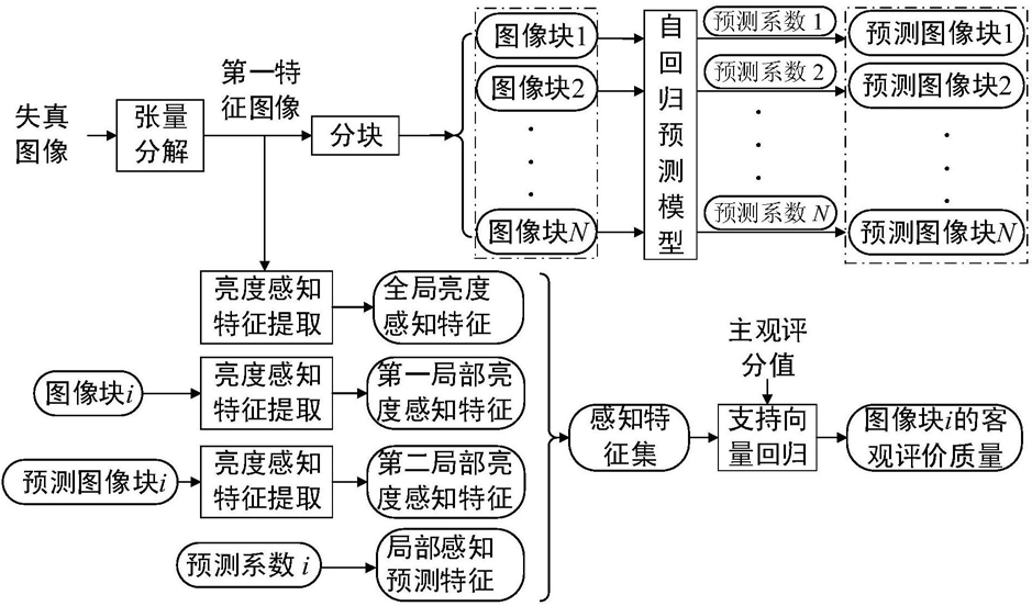 ⑩将Idis中与Gdis1中的每个图像块位置对应且尺寸大小相同的区域的张量域感知特征向量作为输入参数,输入到支持向量回归训练模型中,输出Idis中与Gdis1中的每个图像块位置对应且尺寸大小相同的区域的客观质量评价值,将Idis中与 位置对应且尺寸大小相同的区域的客观质量评价值记为qi;再获取Idis的客观质量评价值,记为qdis,