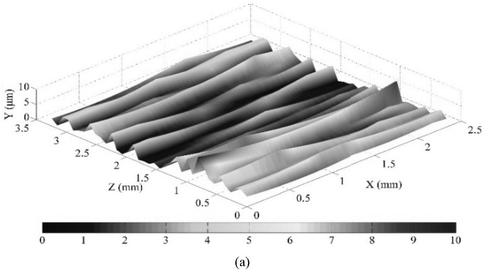 进一步通过磨粒形状与磨粒球心运动轨迹耦合,得到砂轮表面上任意一颗磨粒Gjk上任意一点(xg,yg,zg)的运动方程:(xg-xc(t))2+(yg-yc(t))2+(zg-zc(t))2=(dgjk)2 (d)D、工件离散:将工件被切割成n个间距为Δx且垂直于工件平移方向的截面,截面之间的间距Δx乘以n表示工件的长度;每一截面又切割成m条间距为Δz的竖直线,线段在y方向的长度表示工件的高度,线段之间的间距Δz乘以m表示工件的宽度;这样,工件就离散成n×m条竖直线段;离散化之后,工件可用一个二维数组W表示,储存每一竖直线的高度值,每一线段在数组中的位置用下标u,v表示,u表示X方向的位置,v表示Z方向的位置,0<u<n,0<v<m;第u截面上的第v根竖直线的坐标xuv和zuv表达为:xuv=u*Δx (e)