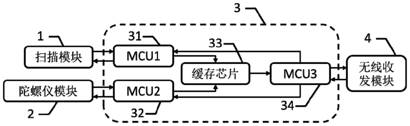 2.根据权利要求1所述手持式激光扫描仪数据传输系统,其特征在于:扫描模块(1)控制输入端与第一处理芯片(31)控制输出端连接,扫描模块(1)数据输出端与第一处理芯片(31)数据输入端连接;陀螺仪模块(2)控制输入端与第二处理芯片(32)控制输出端连接,陀螺仪模块(2)数据输出端与第二处理芯片(32)数据输入端连接;第一处理芯片(31)和第二处理芯片(32)的数据输出端与缓存芯片(33)的数据输入端连接;缓存芯片(33)的数据输出端与第三处理芯片(34)的数据输入端连接;第三处理芯片(34)两个通信端口分别连接第一处理芯片(31)的通信端口和第二处理芯片(32)的通信端口;第三处理芯片(34)的数据输出端连接无线收发模块(4)的数据输入端;第三处理芯片(34)的数据输入端连接无线收发模块(4)的数据输出端。