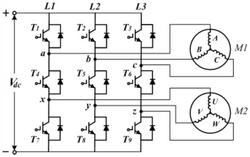 三相电机M1的绕组A连接于逆变器桥臂L1的功率开关管T1与功率开关管T4之间的中点a,三相电机M1的绕组B连接于逆变器桥臂L2的功率开关管T2与功率开关管T5之间的中点b,三相电机M1的绕组C连接于逆变器桥臂L3的功率开关管T3与功率开关管T6之间的中点c;三相电机M2的绕组U连接于逆变器桥臂L1的功率开关管T7与功率开关管T4之间的中点x;三相电机M2的绕组V连接于逆变器桥臂L2的功率开关管T5与功率开关管T8之间的中点y,三相电机M2的绕组W连接于逆变器桥臂L3的功率开关管T6与功率开关管T9之间的中点z。