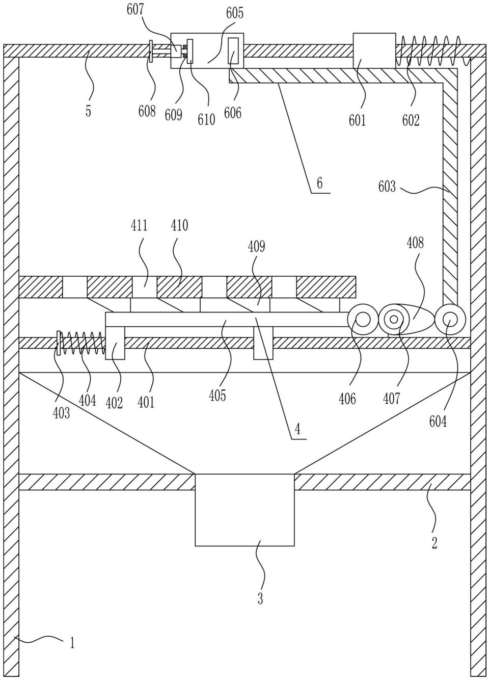 2.根据权利要求1所述的一种化妆刷刷毛修剪设备,其特征在于,切割机构(4)包括有第一滑杆(401)、第一滑套(402)、第一弹簧座(403)、第一复位弹簧(404)、第一连接板(405)、第一接触轮(406)、电机(407)、凸轮(408)、切刀(409)和定位板(410),左右侧支腿(1)之间的中部连接有第一滑杆(401),第一滑杆(401)上设有第一滑套(402),第一滑杆(401)的左侧设有第一弹簧座(403),第一弹簧座(403)与第一滑套(402)之间连接有第一复位弹簧(404),第一滑杆(401)穿过第一复位弹簧(404),第一滑套(402)上设有第一连接板(405),第一连接板(405)的右端设有第一接触轮(406),第一滑杆(401)顶部的右侧安装有电机(407),电机(407)的输出轴上连接有与第一接触轮(406)配合的凸轮(408),第一连接板(405)的顶部设有切刀(409),左侧支腿(1)的右侧中部水平连接有定位板(410),定位板(410)上开有与切刀(409)配合的通孔(411)。