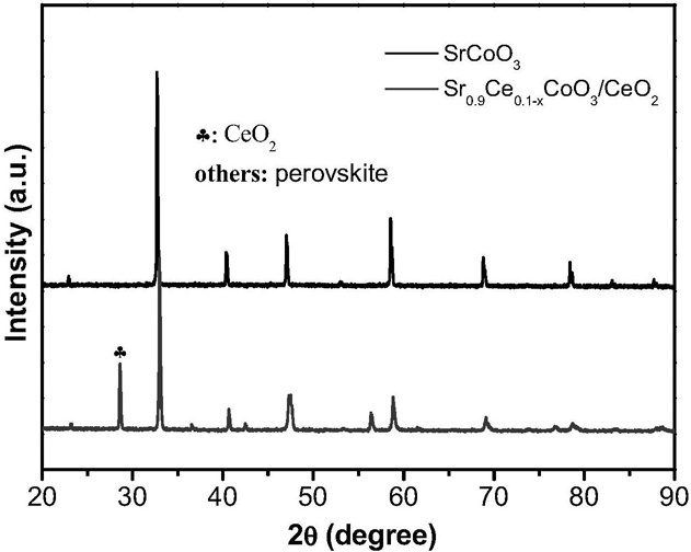 1.本发明提供了一种钙钛矿/氧化铈复合氧催化剂的脱溶复合制备方法,即采用高温还原或高能气氛球磨的方法,在材料体相内析出第二相(氧化铈),在浓度差的驱动下,第二相扩散至材料表面并逐渐长大成纳米颗粒,进而实现氧化铈与催化剂本体的原位复合。其特征在于包含如下步骤:1)制备铈离子掺杂的钙钛矿;2)所述氧化铈的脱溶析出方法包含两种,即高温还原法与高能气氛球磨法。所述高温还原法的步骤为:将所述掺铈钙钛矿在还原气氛中缓慢加热至某一温度,保温若干时间,随炉冷却至室温。所述高能气氛球磨法的步骤为:将所述掺铈钙钛矿在通入还原气氛的球磨罐中,保持还原气氛为一定的压力,室温球磨若干时间。