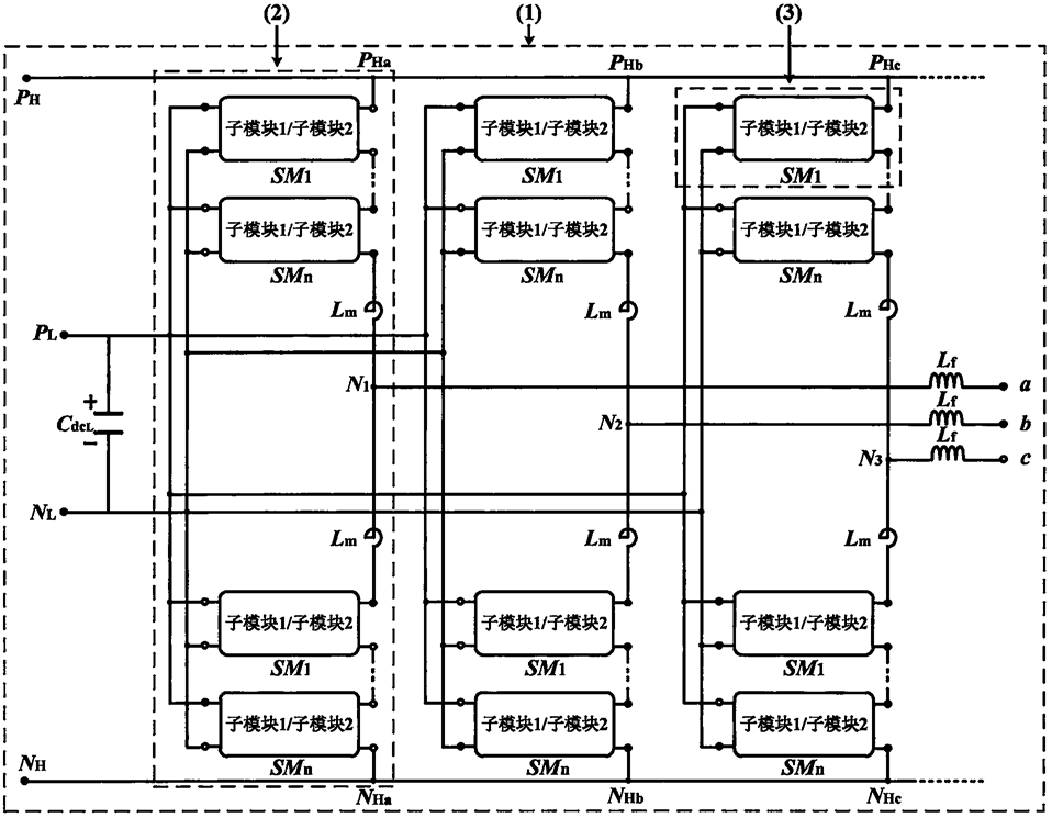 1.隔离型模块化多电平变换器,其特征在于:所述变换器(1)为三相系统结构,包括三个并联在高压直流端口(PH、NH)之间的相单元(2),每个相单元(2)由上、下两个桥臂组成,三个相单元的上、下桥臂的电联接点(N1、N2、N3)引出线串联滤波电感后为高压交流端口(a、b、c),每个桥臂由n个具有高压直流侧故障电流阻断能力的单级式高频隔离型子模块(3)和一个桥臂电抗器Lm组成;三个相单元(2)上桥臂的正极端(PHa、PHb、PHc)相连作为该变换器的高压直流端口的正极PH,三个相单元(2)下桥臂的负极端(NHa、NHb、NHc)相连作为该变换器的高压直流端口的负极NH;