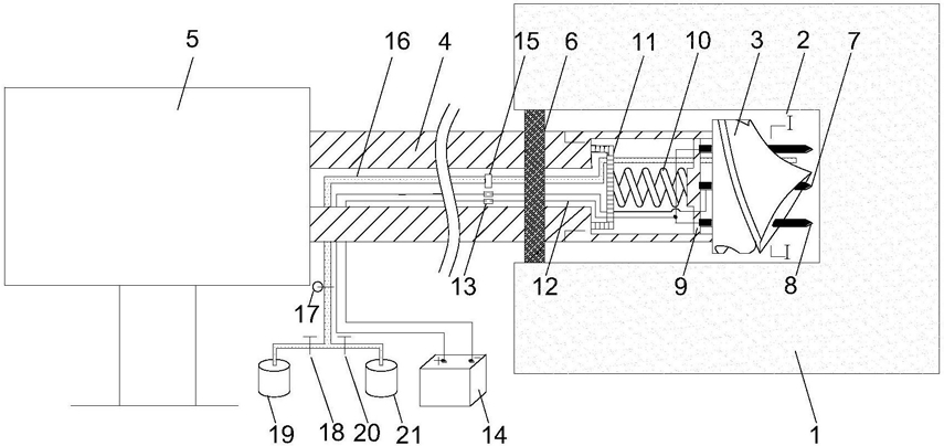 c、利用封孔器(6)对钻孔(2)进行密封,通过高压注水泵站(19)和高压注水管(16)向钻孔(2)内注入一定压力的离子溶液,保持钻孔(2)内水压力恒定1-2h,然后通过排水泵站(21)抽出钻孔(2)内的剩余离子溶液,从而使钻孔(2)前方煤体浸入导电离子溶液;