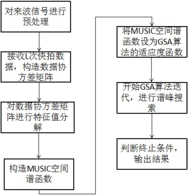 2.如权利要求1所述的基于引力搜索算法的MUSIC谱峰搜索方法,其特征在于,所述方法的具体实现过程包括:步骤1:随机地初始化种群中的粒子,每个粒子都有自己的初始位置,各粒子的位置Xi的表达式为:其中, 和D分别表示粒子i在第k维搜索空间的位置和搜索空间的维数,D也等于待估计信源的个数,N为初始种群大小,算法在各搜索空间的搜索范围在[-90°,90°]之间;