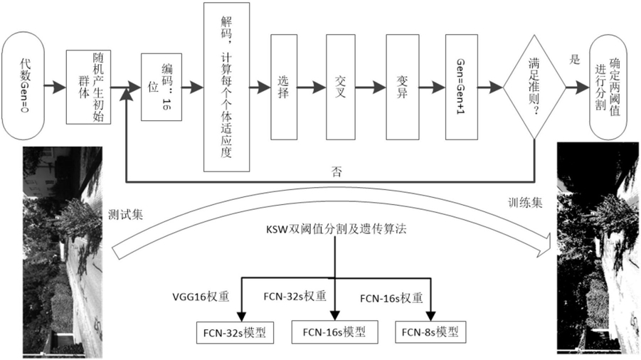 2.如权利要求1所述的基于全卷积神经网路的道路场景分割方法,其特征在于:步骤1a中KSW二维阈值及遗传算法中的初始种群数根据训练样本的大小设定。