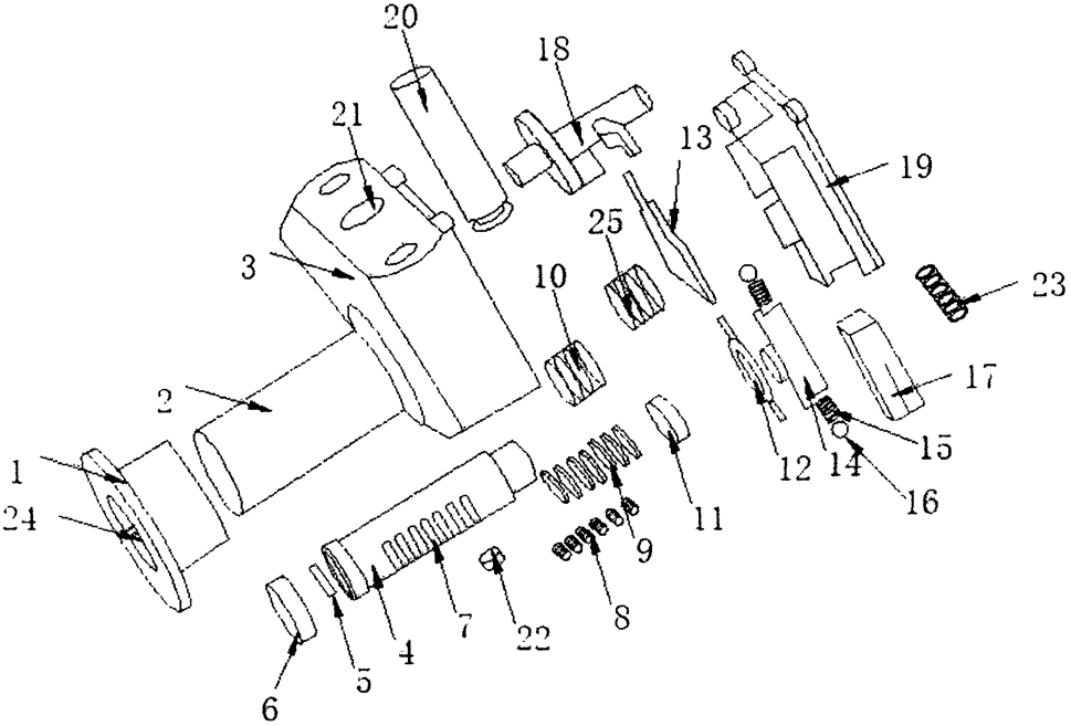 1.一种磁式电源锁,包括面盖(1)、基座(3)和后盖(19),其特征在于,所述面盖(1)的一端通过连接筒(2)与基座(3)固定相连,所述基座(3)的另一端与后盖(19)固定相连,所述连接筒(2)的内部固定连接有锁芯(4),所述锁芯(4)的一端通过翻板(5)与锁芯护面(6)固定相连,所述锁芯(4)内部一侧通过插片弹簧(8)弹性连接有若干插片(9),所述锁芯(4)的另一端通过锁芯回位簧(10)弹性连接有大插片(11),所述大插片(11)的另一端通过封盖(12)固定连接有滑块(13),所述滑块(13)的另一端固定在点火转子(14)上,所述点火转子(14)的内部两端通过钢球弹簧(15)弹性连接有钢球(16),所述点火转子(14)的另一端固定连接在拉线座(17)上,所述拉线座(17)的一侧固定连接在转动轴(18)上,所述转动轴(18)的上端固定连接在后盖(19)上,所述转动轴(18)的下端位于基座(3)的内部通过转轴回位簧(25)弹性连接有锁舌(20)。
