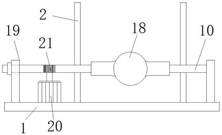1.一种新能源汽车驱动桥内腔毛刺打磨装置,其特征在于:包括底板和打磨杆,所述底板的上表面固定安装高度支撑杆,且高度支撑杆的数量为两个,所述高度支撑杆的前侧壁固定安装驱动桥夹持杆,所述驱动桥夹持杆的内壁开设螺纹孔,所述螺纹孔的内壁螺接螺杆,所述螺杆的下壁固定安装转动轴的固定部,所述转动轴的转动部固定安装下板,所述下板的底面固定安装弹簧的一端,所述弹簧的另一端固定连接上夹持座,所述底板的上表面固定安装下夹持座,所述打磨杆的外壁从左到右依次固定安装左管状气囊、左橡胶连接头、球形气囊、右橡胶连接头和右管状气囊,所述左橡胶连接头和右橡胶连接头的内壁开设气体通道,且球形气囊与左管状气囊和右管状气囊通过气体通道联通,所述右管状气囊的上壁开设充气口,所述左管状气囊、左橡胶连接头、球形气囊、右橡胶连接头和右管状气囊的外壁固定安装磨砂层,所述底板的上壁固定安装凹槽板,且凹槽板的数量为两个,所述凹槽板的上壁开设凹槽,所述底板的上壁固定安装电机,所述电机的转子外壁固定安装蜗轮,所述打磨杆的左侧外壁设有蜗杆纹,所述螺杆的上壁固定安装把手,所述下夹持座的上壁固定安装橡胶垫。