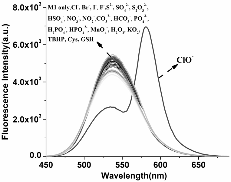 5.根据权利要求1所述的一种荧光比率检测次氯酸根的方法,其特征在于:所述探针M1荧光法检测次氯酸根的浓度线性范围为0-3 µM,最低检出限为1.36×10-8 mol/L。