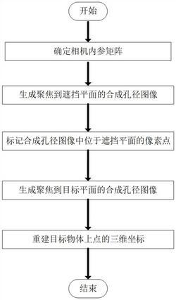 用公式(12)记录像素pd在相机坐标系CV中的齐次坐标式中, 为相机坐标系CV中点的第一维度坐标, 为相机坐标系CV中点的第二维度坐标,d为平面πd的深度; 分别用公式(13)、公式(14)表示式中, 为图像坐标系中点的第一维度坐标, 为图像坐标系中点的第二维度坐标,f为相机的焦距;按照步骤(4)生成聚焦到不同深度平面 的合成孔径图像,得到目标物体上点的齐次坐标 式中dmin为合成孔径成像可聚焦的最小深度,dmax为合成孔径成像可聚焦的最大深度;将齐次坐标 转化为笛卡尔坐标PD式中 分别为齐次坐标 的第一维度坐标、第二维度坐标、第三维度坐标,q为齐次坐标PW的第四维度坐标,完成目标物体上点的三维坐标重建。