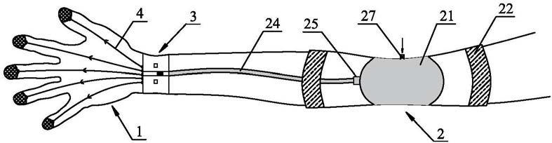 所述液动系统包括弹性液囊以及将所述弹性液囊固定在手臂内侧弯曲处的绷带、位于所述膨胀空间内的且与所述膨胀空间形状相匹配的膨胀包、以及连接所述弹性液囊与所述膨胀包的软管,所述弹性液囊体积应大于等于两倍的所述膨胀包体积;