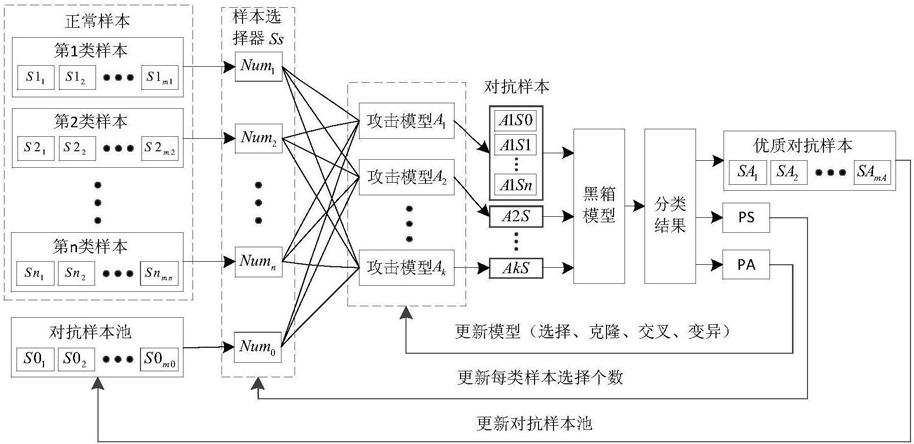 2.如权利要求1所述的基于样本选择和模型进化的黑盒对抗性攻击防御方法,其特征在于:所述步骤1)中,用样本选择器从多类样本中随机选择样本,输入到多个不同的攻击模型中并生成对抗样本,使得每类样本和攻击模型都会相互结合。通过训练样本、攻击模型的多样性保证生成的对抗样本的多样性,为后续的更新提供基础。
