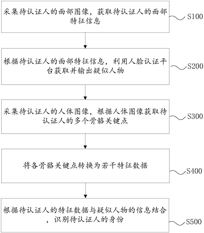 3.如权利要求1所述的身份认证方法,其特征在于,利用人脸认证平台获取并输出疑似人物,包括:所述人脸认证平台根据所述待认证人的所述面部特征信息,输出多个所述疑似人物,并对各所述疑似人物的面部进行打分。