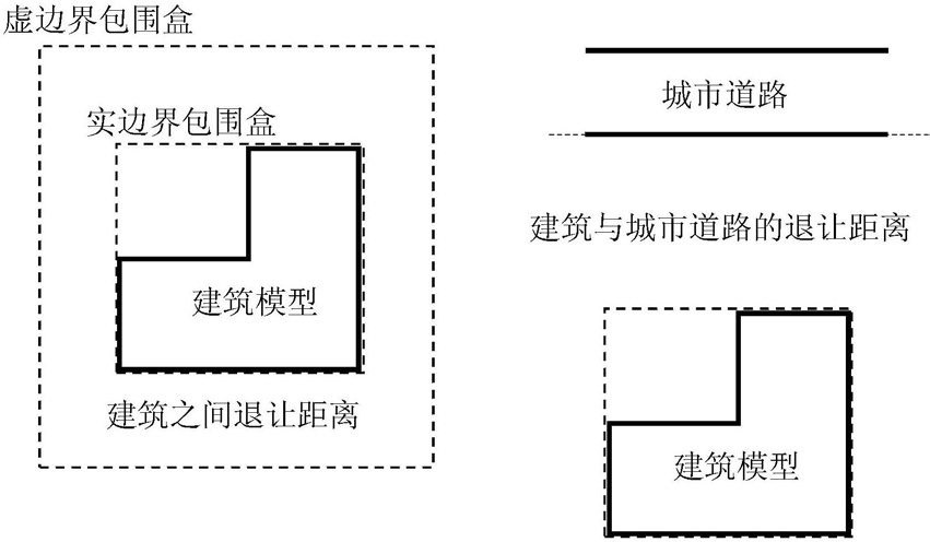 (3)提出三种约束类型优化城市场景,结合双层OBB包围盒技术,生成以模型主体为基础的实边界和建筑规范约束下的虚边界,步骤如下:(3.1)在三维城市场景中,加入一个建筑模型时,获取该建筑模型的中心点和地基的长宽,生成实边界包围盒,再根据约束条件,生成虚边界包围盒进行碰撞检测;