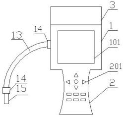 1.一种光谱分析装置,其特征在于,包括机身、机身顶部安装的热敏打印机和机身底部安装的鱼尾把手,其中:所述机身为空心长方体结构,机身的正面设置有用于显示数据的液晶屏,机身的侧面设置有用于置入待检物的检测入口和用于连接光纤束的光纤接口;所述鱼尾把手的正面设置有用于信息交互的键盘,机身的背面设置有用于安放电池的电池盒;