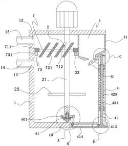横杆(711)和设于两横杆之间的多个间隔分布的连接杆(712),每个连接杆(712)对应设置 一组沉降组件(72)。4.根据权利要求3所述的一种污水的絮凝沉淀池,其特征在于:所述沉降组件(72)包括 多个沿所述连接杆(712)长度方向上间隔均匀分布的沉降板(721)。5.根据权利要求4所述的一种污水的絮凝沉淀池,其特征在于:所述沉降板(721)为倾 斜设置,该沉降板(721)轴线与连接杆(712)轴线之间的夹角为60°。6.根据权利要求3所述的一种污水的絮凝沉淀池,其特征在于:所述支撑部(73)为由所 述池体内壁向外延伸形成的凸条(731),所述放料室(3)侧壁上具有与所述横杆相配合的条 形凸部(33)。7.根据权利要求1所述的一种污水的絮凝沉淀池,其特征在于:所述传动机构(4)包括 与所述搅拌部件(2)相配合的传动部件(41)和用于开启所述放料开关(32)的开关部件 (42),所述开关部件(42)与所述传动部件(41)相配合。8.根据权利要求7所述的一种污水的絮凝沉淀池,其特征在于:所述开关部件(42)包括 用于开启所述放料开关(31)的活动杆(421)和用于推动所述活动杆(421)向上动作的推动 件(422)。