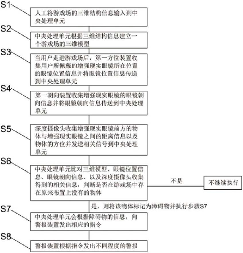 9.根据权利要求2所述的一种基于游戏场的增强现实眼镜的预警方法,其特征在于,还包括:在步骤S6时,红外传感器会收集增强现实眼镜前方障碍物的温度信息并发送到中央处理单元,在步骤S7时,当前方障碍物温度大于40℃或小于0℃时,中央处理单元会发出指令让所述警报装置发出声音警报。