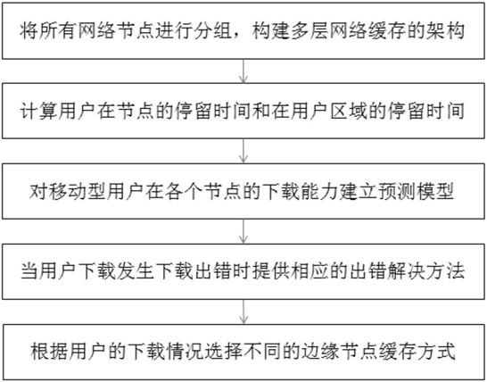 基于多层网络缓存架构和各个处理模型在移动用户访问的过程中根据用户的下载情况有效调整边缘节点的缓存方式,包括根据用户下载能力的预测调整不同的提供数据缓存的节点,通过用户下载出错模型调整提供下载和后续数据缓存的位置节点,实现选择不同的边缘节点缓存选择方式。