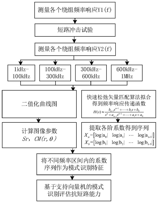8)当对卷铁心牵引变压器进行抗短路能力评估时,测量得到变压器短路冲击试验前后的频率响应,并通过步骤3)、4)、5)得到样本输入矩阵,将输入矩阵代入分类器中计算,得到抗短路能力;