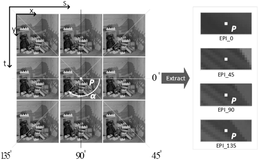 步骤1‑2:将每一个4D光场场景定义为LF(s,t,x,y),其中(x,y)是图像空间坐标系,(s,t)是角度坐标系;对于中心子光圈图像LF(4,4,x,y)上的任一点P,提取P点的0°、45°、90°、