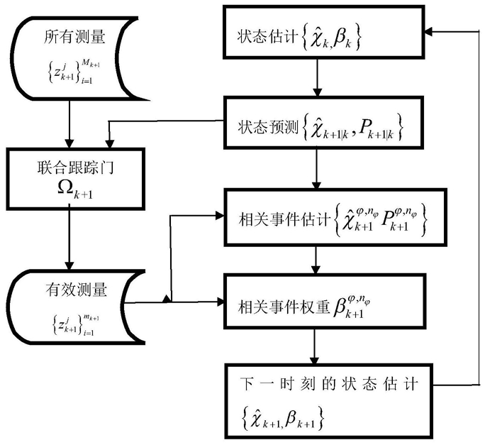 其中 表示源于扩展目标的有效测量个数, 表示源于扩展目标的测量个数为 的相关事件个数,mk+1表示第k+1时刻的有效测量个数,PG表示来源于扩展目标的测量落入跟踪门内的概率; 和 分别表示在相关事件 中联合的新息和协方差;Vk+1表示第k+1时刻联合跟踪门的面积,N(·;·,·)为正态分布;