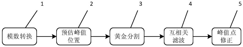 所述步骤3中采用黄金分割法对极大值点所在位置范围进行分割,具体分割方式为:预估峰值位置为M,峰值位置对应区间为[M+Δ,M-Δ],以该范围的左右端点位置分别为基准进行黄金分割,可得到对应的左黄金分割点和右黄金分割点,对应于左黄金分割域和右黄金分割域,对黄金分割点进行互相关滤波,选择滤波输出高的分割点所对应区域再次进行黄金分割,每进行一次黄金分割峰值范围都会缩小0.618倍。