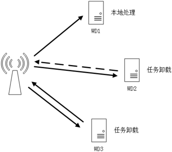 1)在一个由一个基站和多个无线设备组成由无线供电的边缘计算系统中,基站和每个无线设备都有一个单独的天线;射频能量发射器和边缘计算服务器都集成在基站中,假设基站有一个稳定的能量供给,并且能广播射频能量给所有无线设备,每一个无线设备都有一个能量收集电路和一个可充电电池,通过存储收集的能量来完成一些任务;在这个无线通信系统中,每个无线设备都需要与基站建立联系,无线设备i与基站之间的信道增益hi计算为: