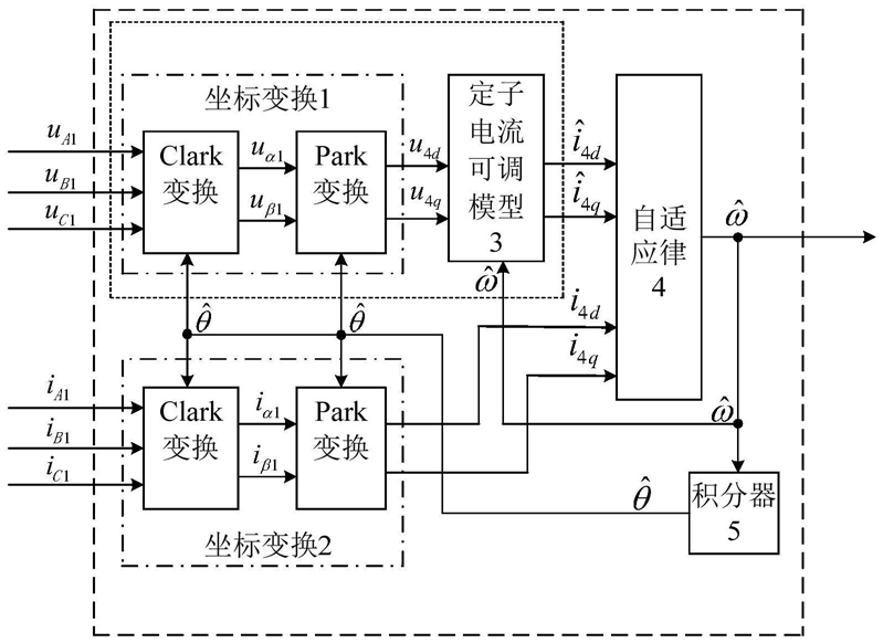 3)建立自适应律,根据电机定子转矩绕组d-q轴电流估计值和电机定子转矩绕组d-q轴电流i4d、i4q的误差值重新计算并调整电机转速估计值将调整后的电机转速估计值经积分器重新得到转子位置角估计值并作为坐标变换的输入信号,将调整后的电机转速估计值作为定子电流可调模型的输入信号,以实时根据三相检测电压和三相检测定子电流估算出实时的电机转速估计值在步骤1)中,构建坐标变换,坐标变换包含Clark变换和Park变换,三电机转矩绕组三相检测电压uA1、uB1、uC1、当前转子位置角估计值为输入信号,经Clark变换输出两相静止坐标下的电压检测值uα1、uβ1,再经Park变换输出两相同步旋转坐标下的电机定子转矩绕组d-q轴电压u4d、u4q;以无轴承同步磁阻电机转矩绕组三相检测定子电流iA1、iB1、iC1、当前转子位置角估计值为输入信号,经Clark变换输出两相静止坐标下的电流检测值iα1、iβ1,再经Park变换输出两相同步旋转坐标下的电机定子转矩绕组d-q轴电流i4d、i4q;在步骤2)中,构造定子电流可调模型,具体如下:2.1)构建无轴承同步磁阻电机在d-q坐标下的转矩绕组定子电流参考模型;首先建立电机转矩绕组电压方程,设定无轴承同步磁阻电机为4极转矩绕组和2极悬浮绕组,电机凸极转子极弧角度为30°,转子凸极区域的气隙为δ0,在两相同步旋转d-q坐标系下,电机转矩绕组电压方程为:式中u4d、u4q为定子转矩绕组d-q轴电压,i4d、i4q分别为定子转矩绕组d-q轴电流,Rs1是定子转矩绕组电阻,ω为转子角速度,L4d、L4q分别为定子d-q轴转矩绕组自感,为微分算子;