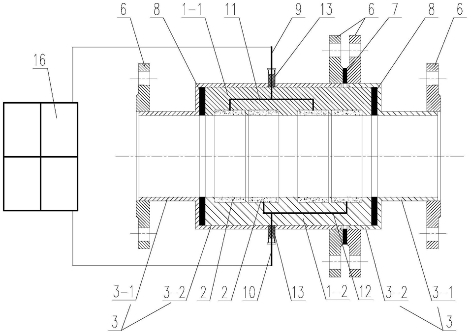 4.根据权利要求1所述的基于电解微气泡实现流体减阻的减阻管道,其特征在于:所述变径外管(3)的主流段(3-1)和电解段(3-2)上均具有法兰(6),两个变径外管(3)的电解段(3-2)上的法兰(6)之间设置有垫片(7)。