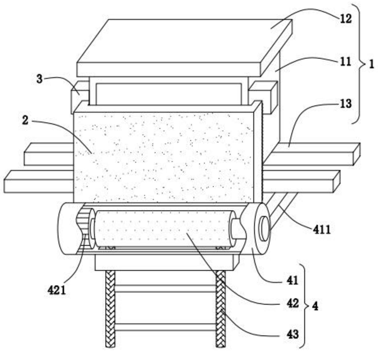 7.根据权利要求1所述的一种变阻抗变压器,其特征在于:所述攀爬机构(4)包括储存管(41)、卷筒(42)以及绳梯(43),所述储存管(41)的侧壁对称垂直固定有支撑杆(411),所述支撑杆(411)与所述安装架(13)的底面垂直焊接,所述储存管(41)的内部转动连接有所述卷筒(42),所述卷筒(42)的外壁缠绕有所述绳梯(43),所述绳梯(43)贯穿于所述储存管(41)的底面,所述卷筒(42)转动连接转动电机(421)。