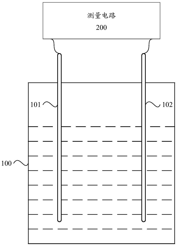 1.射频导纳物位仪中基于温度补偿的物位测量单元,其特征在于,包括:第一测量电极、第二测量电极以及与第一、第二测量电极电连接的测量电路,所述第一、第二测量电极的下端皆插入至物位待测的物料容器中,上端电连接至所述测量电路;其中,将第一、第二测量电极分别等效为一电容的两个极板,第一、第二测量电极之间的物料为电介质,以该电容为待测电容C测;