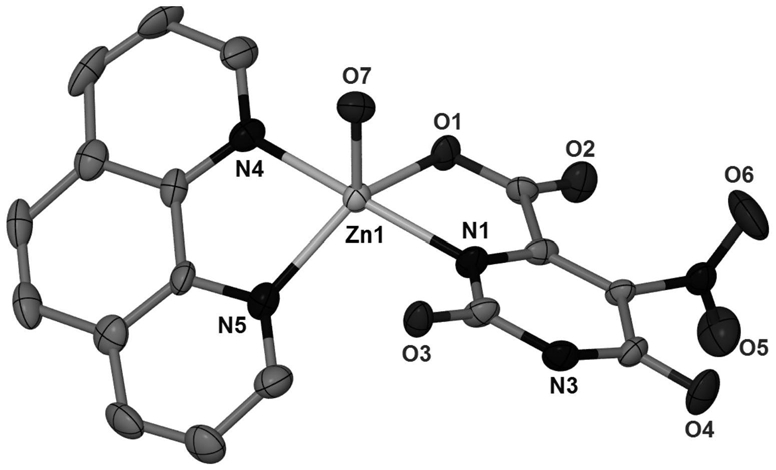 1.一种5-硝基乳清酸单核锌配合物,其特征在于,该配合物的结构单元是由一个金属锌离子、一个5-硝基乳清酸根、一个1,10-邻菲罗啉、一个配位水分子组成,其结构简式为[Zn(HL)(phen)(H2O)],分子式为C17H11N5O7Zn,晶系为三斜,空间群为P-1,α=71.106°,β=77.759°,γ=75.990°;锌离子为五配位的几何构型,其中两个氮配位原子来自于1,10-邻菲罗啉配体,一个氧原子和一个氮原子来自5-硝基乳清酸根,一个氧原子来自配位水分子;