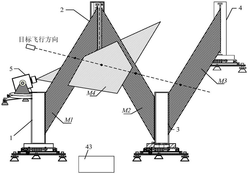 (2)第一探测光幕(M1)与第二探测光幕(M2)的距离为S2,第一探测光幕(M1)与第二探测光幕(M2)交汇角度为(θ2-θ1),目标经过第一探测光幕(M1)、第二探测光幕(M2)的时刻值分别为t1、t2,则可以确定飞行目标的坐标(3)第一探测光幕(M1)与第四探测光幕(M4)交汇角度为θ3,目标经过第一探测光幕(M1)、第四探测光幕(M4)的时刻值分别为t1、t4,其中, k为线阵CCD的扫描速率,则可以确定飞行目标的坐标y=tanθ3·v·(t4-t1)。
