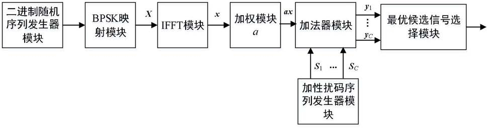 所述二进制随机序列发生器模块与BPSK映射模块相连接,所述BPSK映射模块与IFFT模块相连接,所述IFFT模块与加权模块a连接,所述的加权模块a与加法器模块相连接,所述的加法器模块同时与加性扰码序列发生器模块和最优候选信号选择模块相连接。