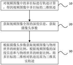 根据摄像头参数获取视频图像与物理世界的映射比例,根据视频图像的深度信息和与物理世界的映射比例,将多目标的二维相对轨迹还原为三维真实轨迹。