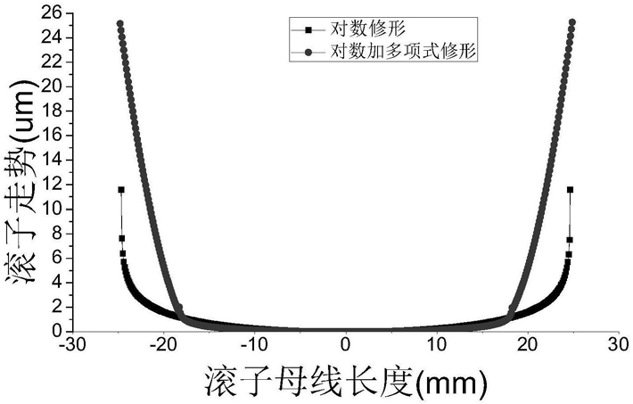 1.一种圆锥滚子轴承的修形方法,其特征在于,利用对数曲线对以滚子与滚道接触点为原点的沿接触线长度方向延伸设定长度的部分进行修形,利用二次多项式曲线对延伸设定长度之外的剩余部分进行修形。