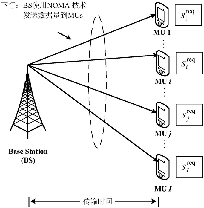 (1)在基站的覆盖范围下总共有I个移动用户,移动用户用集合 表示,基站使用非正交接入技术同时向移动用户发送数据,其中移动用户i需要接收的数据量用表示;